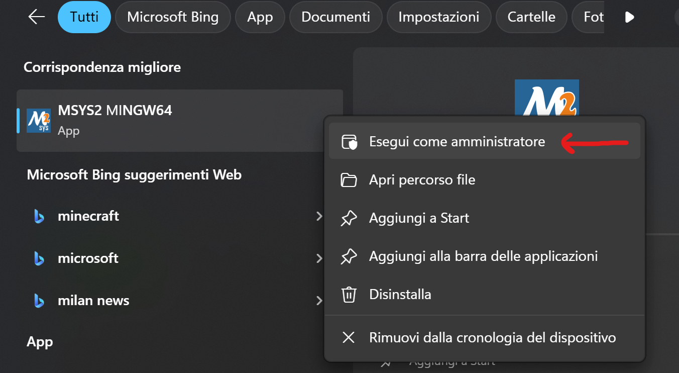After installation, run MSYS2 MINGW64 directly, as an administrator: